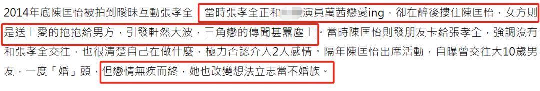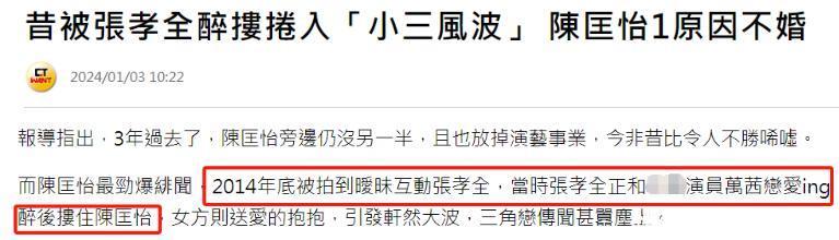 还有一段厚谊就更窘态了,雷同又是媒体发力,拍到了陈匡怡和男星张孝全醉后亲密互动,然则其时张孝全并不是独身,他和女星万茜走动中呢,陈匡怡径直被质疑参预他东说念主厚谊当小三,形象岌岌可危。