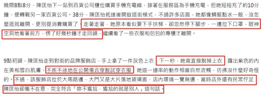 陈匡怡系数东说念主的状态特地奇怪,她赫然没作念到在外过夜的准备,连手机充电线都是临时买的,逛起街来都漫无场合,频繁停驻来发怔。